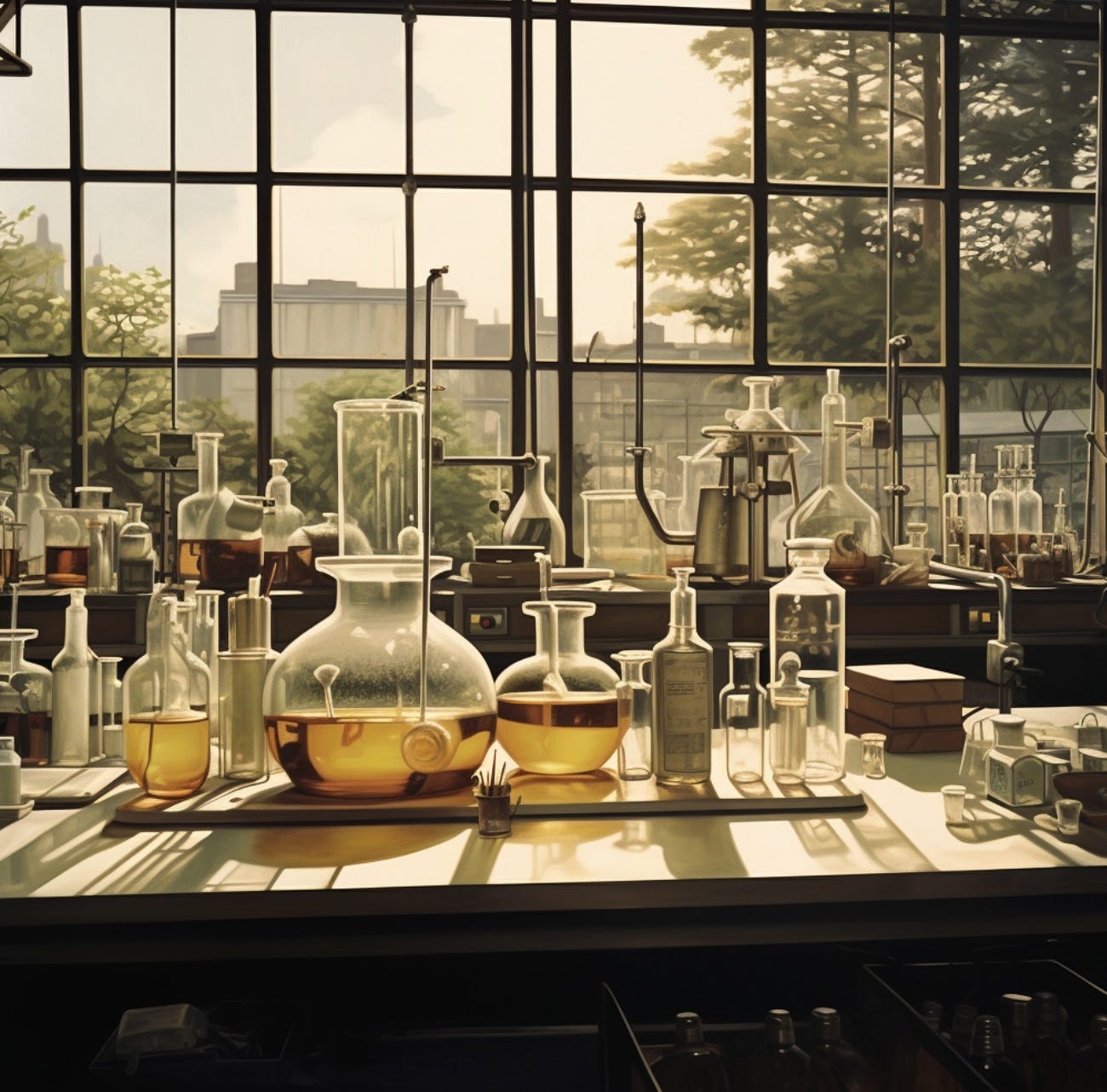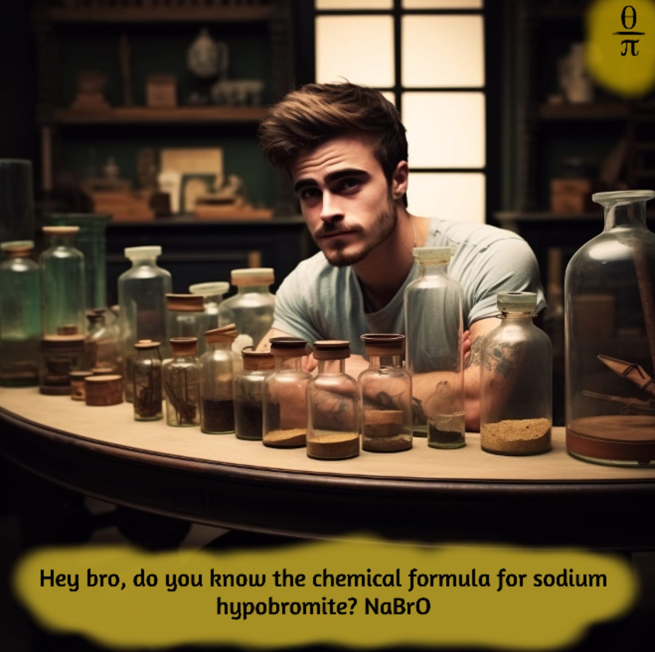 Picture a chemical lab setting with beakers and flasks. In the foreground, have a container labeled "NaBrO" (sodium hypobromite), and maybe throw in a playful visual twist like a happy Na, Br, and O elements forming a trio with smiles. It visually represents the chemical formula while adding a touch of humor to the scientific setting.
